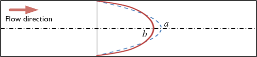 For a flow along a channel without heated, after it is fully developed, the velocity pattern at a cross area is parabolic. However, if the flow is also heated, the parabolic velocity pattern will be twisted because of the viscosity dependency of the fluid (this is true for many types of liquid). This phenomenon is pictorially shown as the figure below, in which (a) is the parabolic velocity profile, and (b) is the distorted profile in a heated duct due to the temperature dependency of the fluid viscosity.